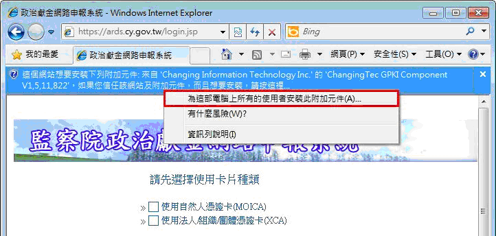若作業系統為 Windows7 / Vista 時,預設會阻擋控制項的下載,於頁面頂端會出現資訊列,請點選資訊列,按【為這部電腦上所有的使用者安裝此附加元件(A)...】。
