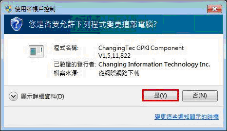 出現使用者帳戶控制,請按【是(Y)】,允許變更