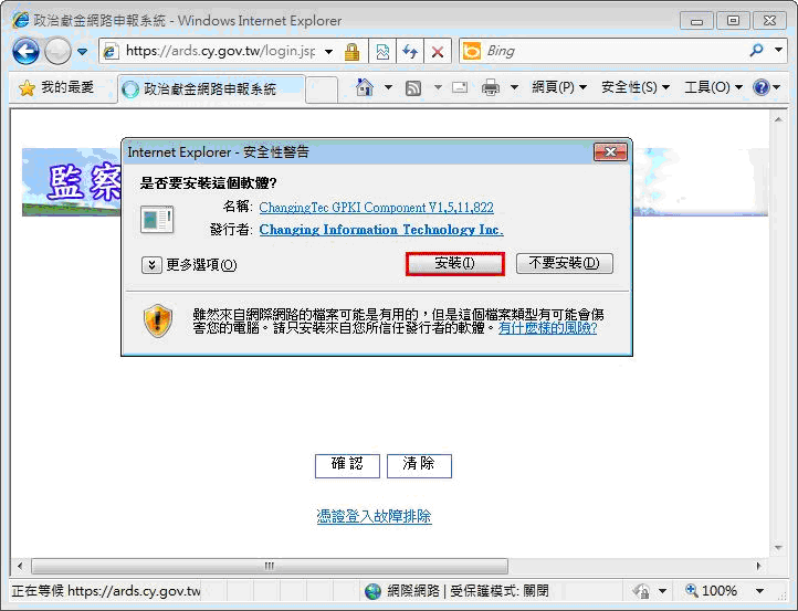 接下來會出現【安全性警告】對話視窗,詢問是否安裝ChangingTec GPKI Component V1,5,11,822,請按【安裝】鈕,安裝Active X元件。